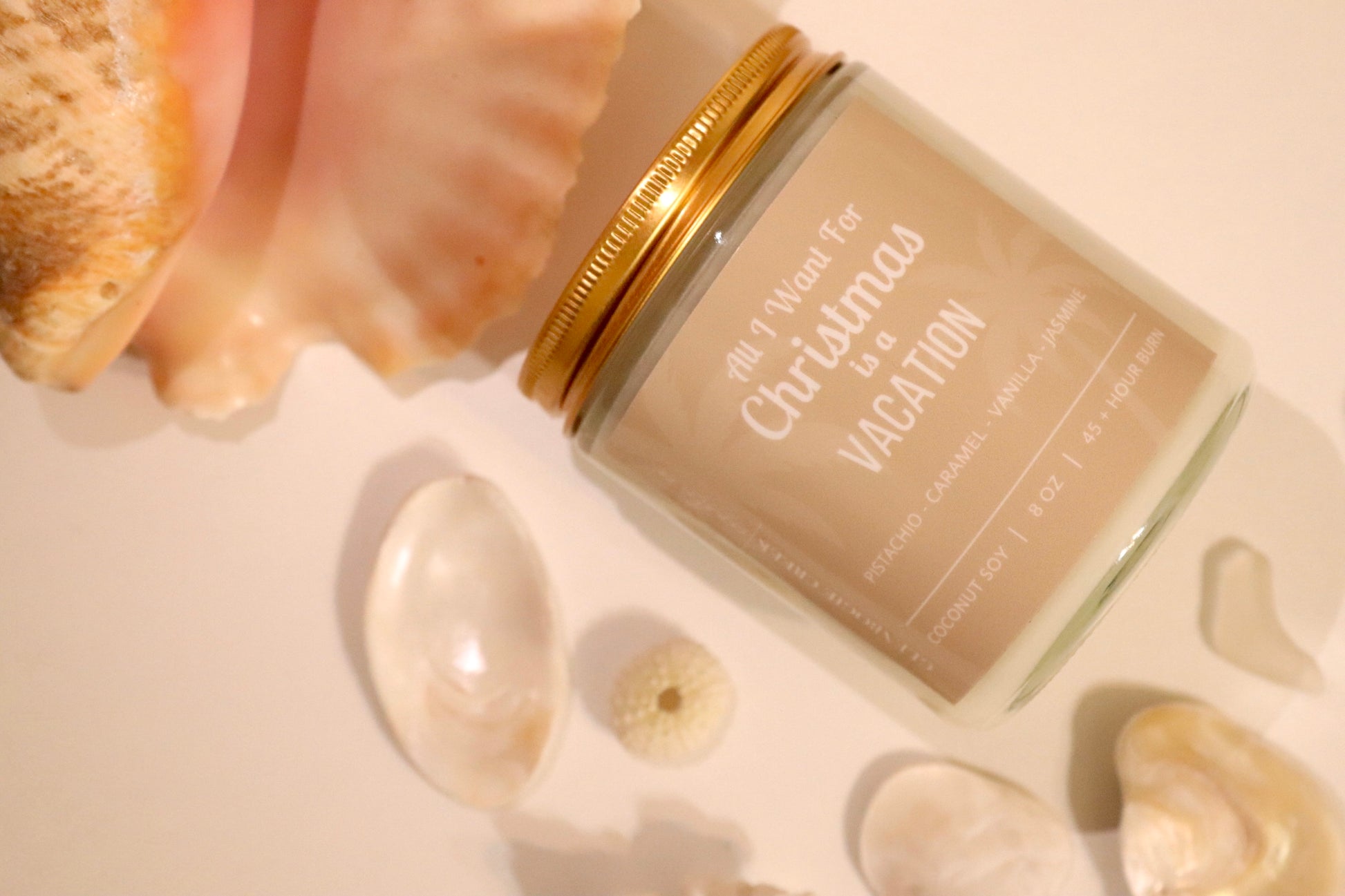 Trade the snow for sunshine. This beachy-holiday blend layers creamy pistachio, warm caramel, soft vanilla, and breezy jasmine for a scent that feels like Christmas spent oceanside. Sweet, warm, and sun-kissed... your tropical escape is one wick away!